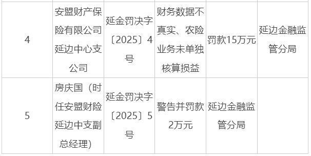 2月18日快讯:延边金融监管分局最新行政处罚信息公开显示,安盟财产保险延边中心支公司因财务数据不真实以及农险业务未按规定单独核算损益,被罚款15万元。同时,该支公司时任副总经理房庆国也因同样原因受到警告,并被罚款2万元。